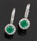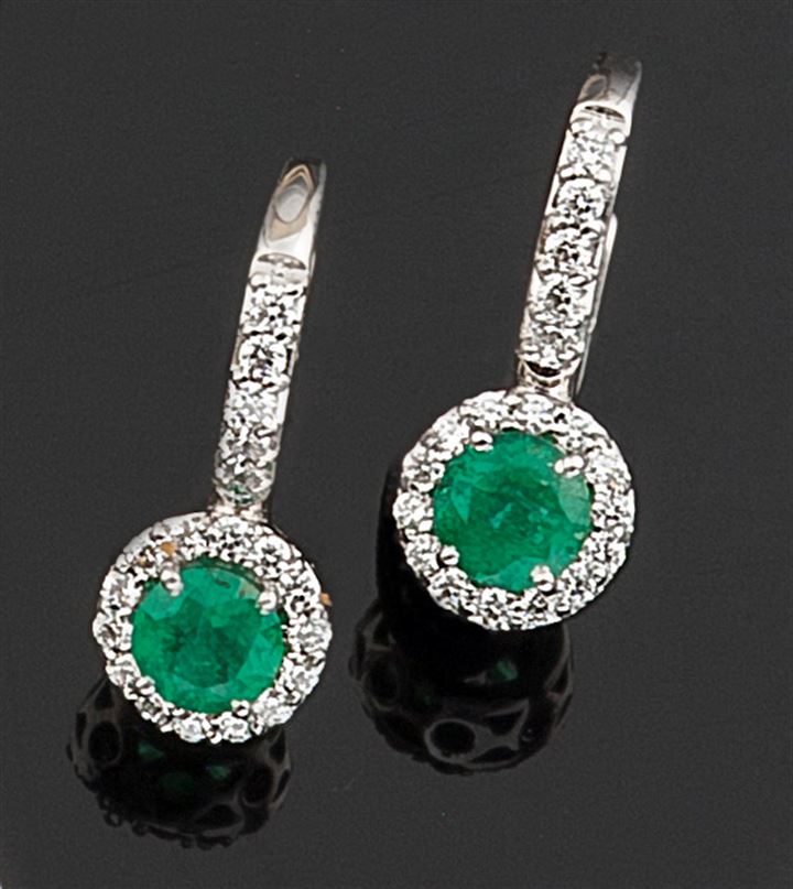 Coppia di orecchini in oro bianco, a monachella, con due smeraldi taglio rotondo e diamantini taglio brillante per complessivi ct 0,30 ca