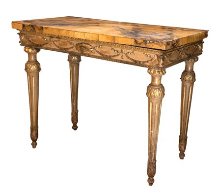 Consolle Luigi XVI dorata con piano in marmo lastronato giallo antico