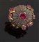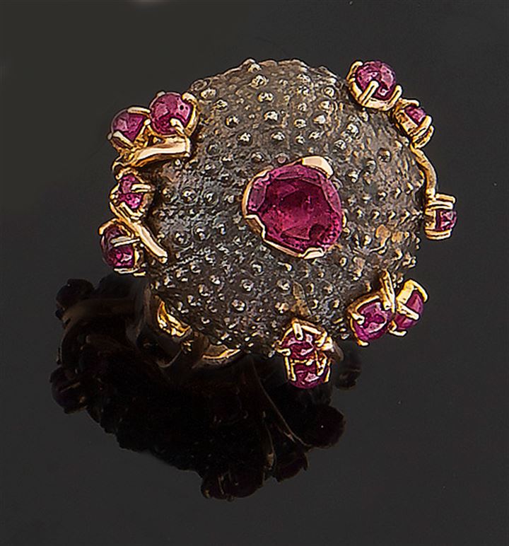 Particolare anello in oro giallo e brunito, sommità tremblant a forma di riccio di mare con al centro rubellite taglio a cuore ed ai lati rubini taglio cabochon