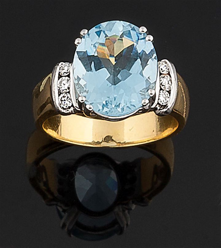 Anello in oro giallo e bianco con al centro acquamarina taglio ovale ed ai lati sei diamanti taglio brillante per complessivi ct 0,25 ca