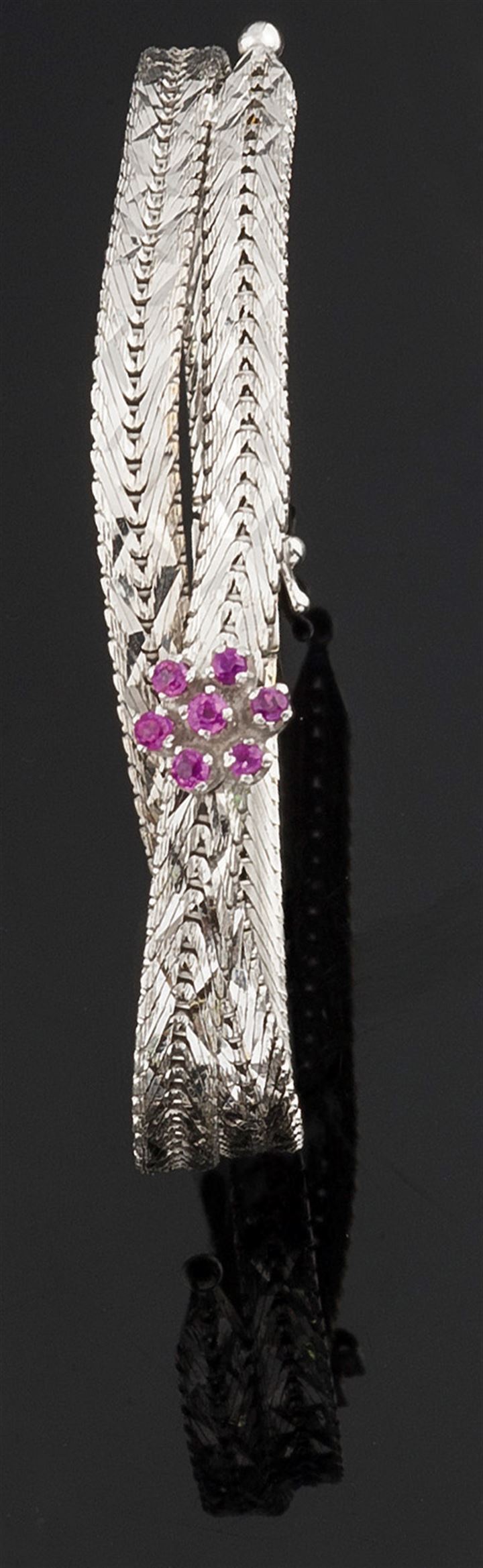 Bracciale in oro bianco lucido e satinato, ad intreccio, con al centro fiore in rubini taglio rotondo
