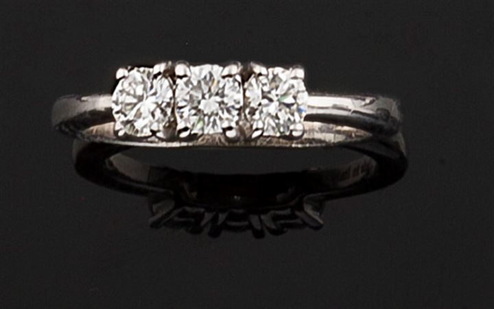 Anello in oro bianco, modello trilogy, firmato "Salvini", con tre diamanti taglio brillante per complessivi ct 0,60 ca