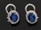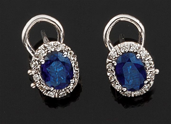 Coppia di orecchini in oro bianco, a lobo, con due zaffiri taglio ovale per complessivi ct 1,98 ca contornati da diamanti taglio brillante per complessivi ct 0,35 ca