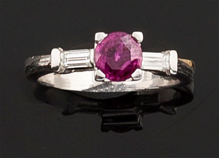 Anello in oro bianco con al centro rubino taglio rotondo ed ai lati due diamanti taglio baguette per complessivi ct 0,30 ca