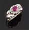 Anello in oro bianco, sommità ad intreccio recante al centro un rubino di taglio ovale contornato da piccoli