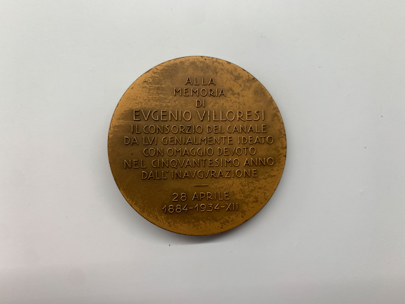 Medaglia coniata edita in occasione del cinquantesimo anniversario della morte dell' Ingegnere Eugenio Villoresi, ideatore del "Canale Villoresi" per l'irrigazione della pianura Milanese