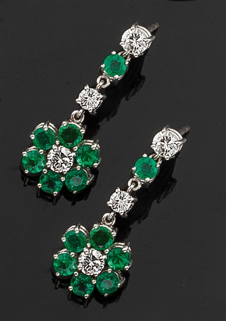 Coppia di orecchini in oro bianco con smeraldi taglio ovale per complessivi ct 2,20 e diamanti taglio brillante per complessivi ct 0,90 ca