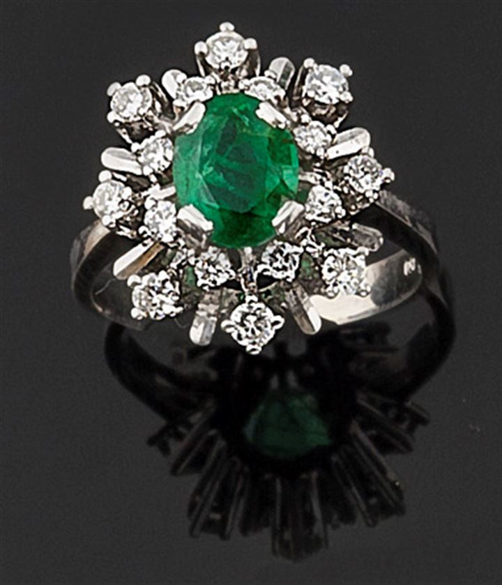 Anello oro bianco con smeraldo centrale taglio ovale contornato da piccoli diamanti taglio brillante per complessivi ct 0,50 ca