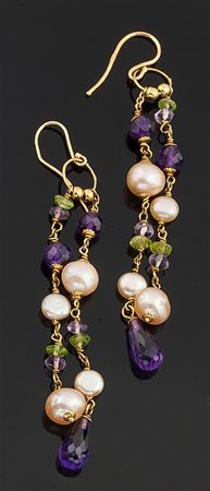 Coppia di orecchini in oro giallo con due fili pendenti con perline di fiume, ametiste taglio a goccia e sfaccettato e peridotti