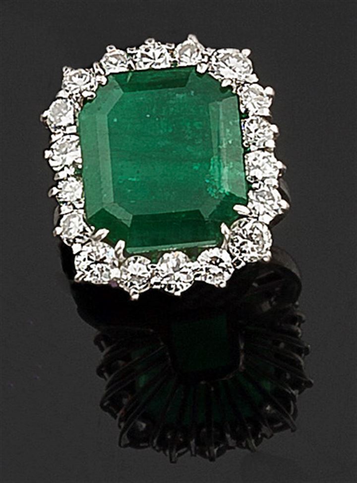 Anello in oro bianco con al centro grande smeraldo taglio rettangolare contornato da diamanti taglio brillante per complessivi ct 1,90 ca