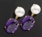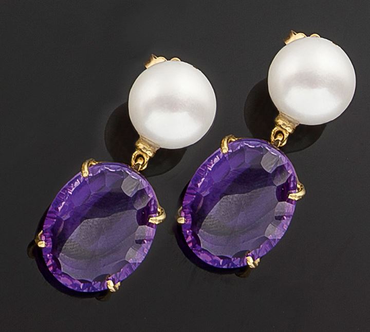 Coppia di orecchini pendenti in oro giallo con due perle di acqua dolce e due ametiste ovali