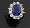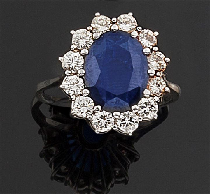 Anello in oro bianco con al centro zaffiro taglio ovale circondato da dodici diamanti taglio brillante per complessivi ct 1,20 ca