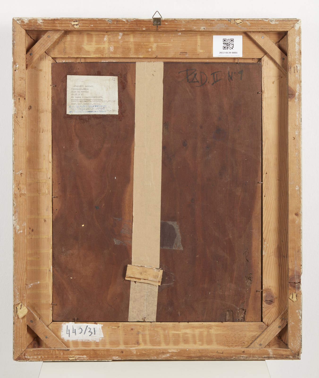 SOLDATI ATANASIO (1896 - 1953) Paesaggio. 1944. Olio su tavola. Cm 38,00 x 47,00. Firma in basso a destra. Al retro cartiglio descrittivo con firma e timbro della Dr.ssa Claudia Gianferrari. Opera archiviata presso l'Archivio Atanasio Soldati, Riale, come da documentazione fotografica allegata all'opera riportante il relativo numero d'inventario. Provenienza: Collezione privata, Parma; Galleria Niccoli, Parma; Collezione privata. Esposizione: Atanasio Soldati, Chiostri S. Caterina, Finale Ligure, 1996. Lievi difetti. . Cornice presente