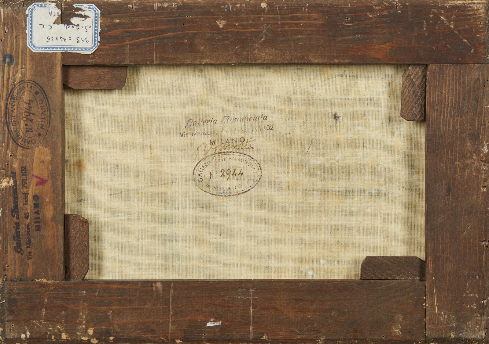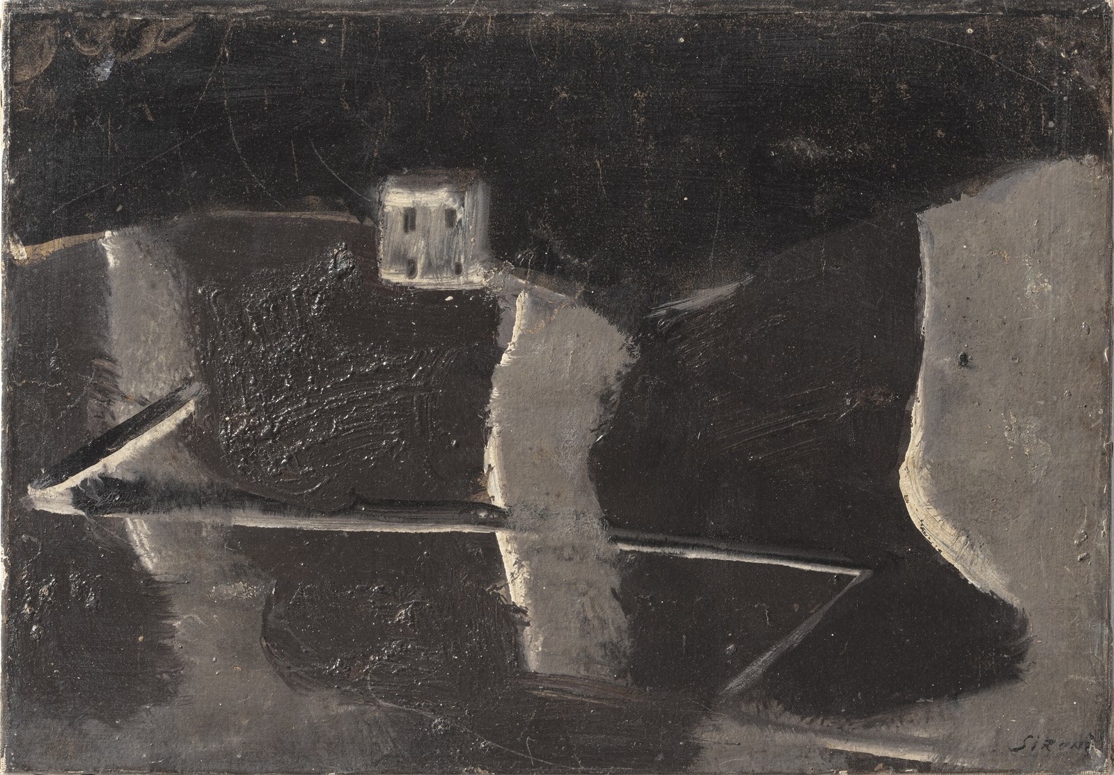 SIRONI MARIO (1885 - 1961) Paesaggio. 1953. Olio su carta su tela. Cm 32,80 x 23,00. Firma apocrifa in basso a destra. Autentica su fotografia di Francesco Meloni. Opera archiviata presso l'Associazione per il Patrocinio e Promozione della figura e dell'opera di Mario Sironi, Milano, come da documentazione allegata all'opera riportante il relativo numero d'inventario. Difetti.