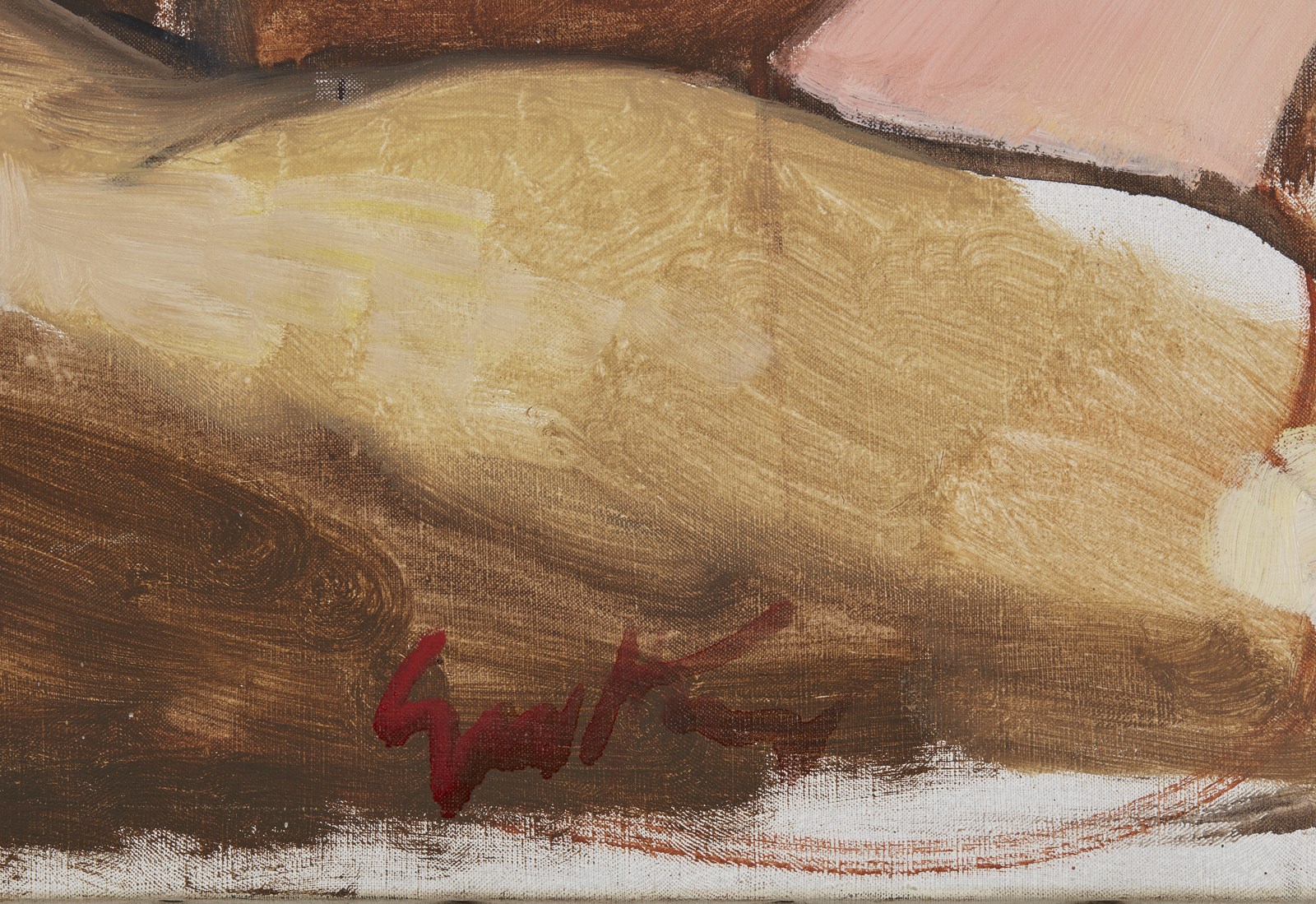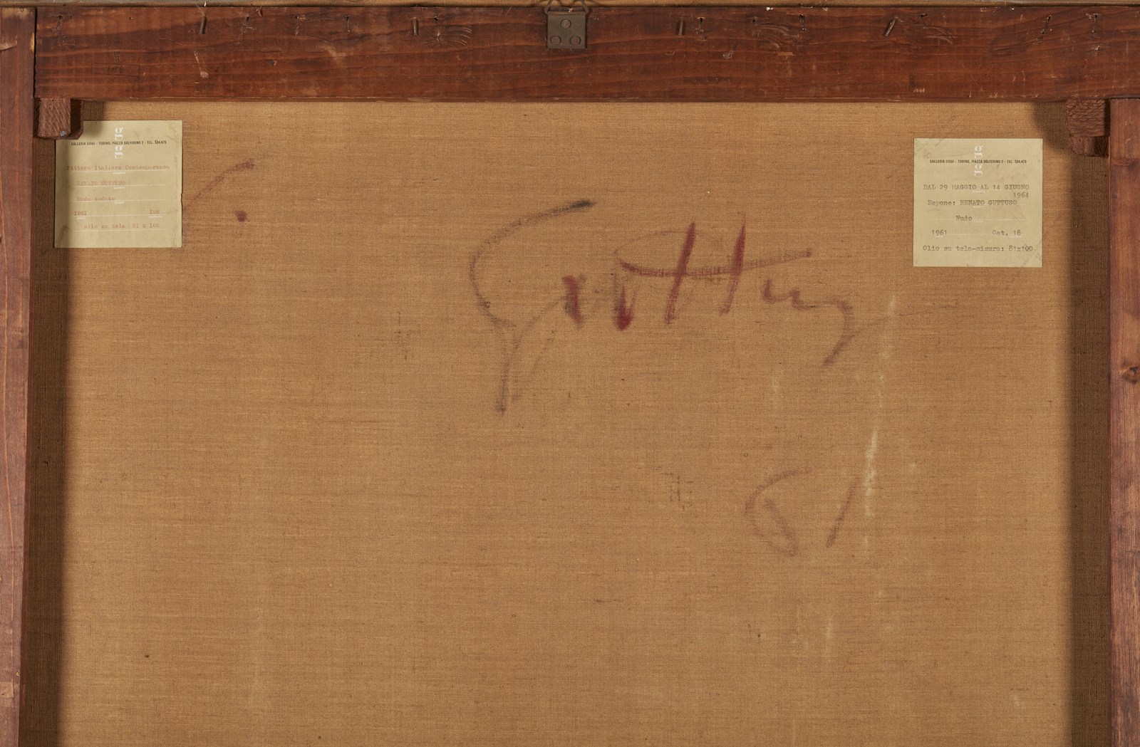 GUTTUSO RENATO (1912 - 1987) Nudo. 1961. Olio su tela . Cm 81,00 x 100,00. Firma in basso al centro. Al retro firma e anno. Pubblicazione: Catalogo ragionato dei dipinti di Renato Guttuso, Volume II, a cura di Enrico Crispolti, Giorgio Mondadori e Associati Editore, 1985, p.225, tav.61/82. Autentica su fotografia della Galleria Borgogna, Milano. Esposizione: Galleria Gissi, 1964. Provenienza: Galleria Gissi, Torino; Galleria Borgogna, Milano; Collezione privata, Milano. Lievi difetti. . Cornice presente