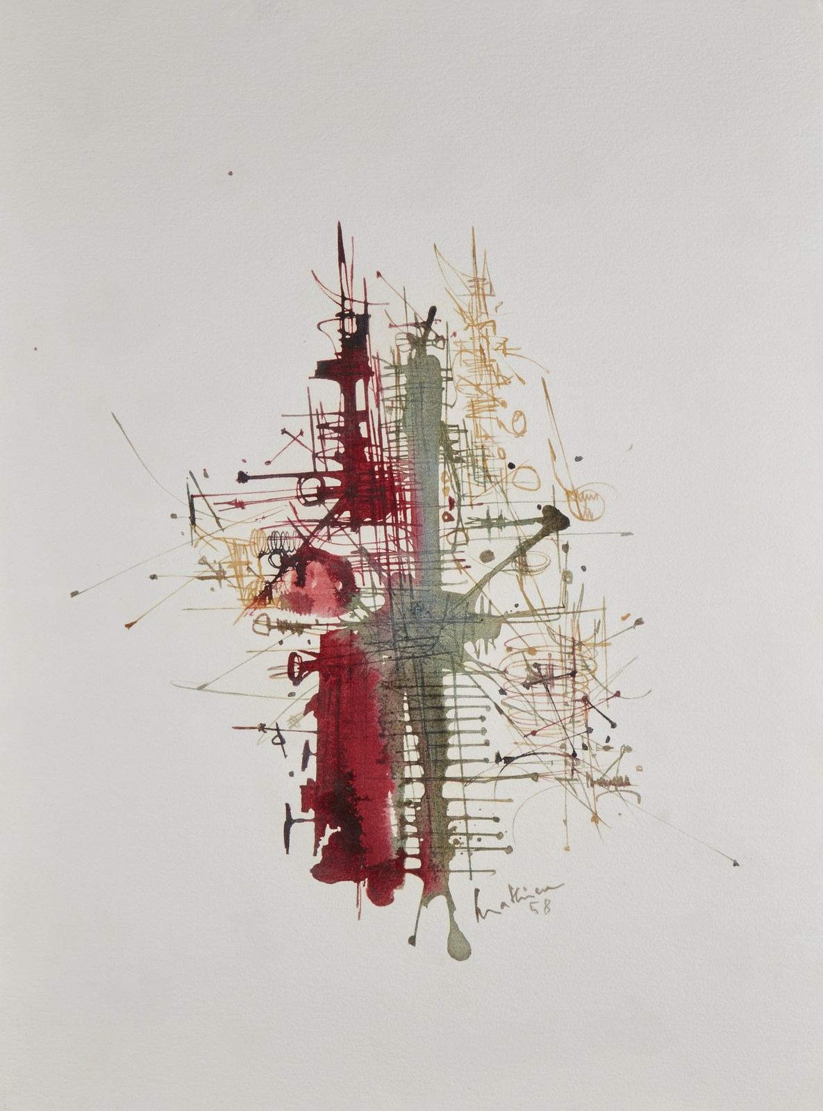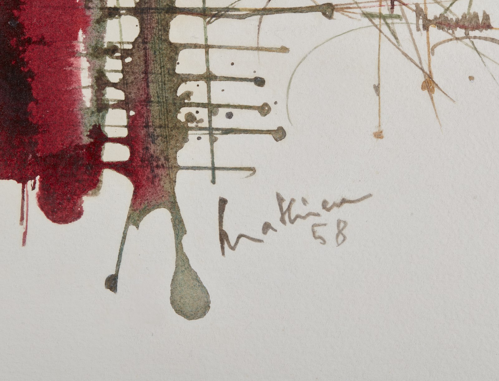 MATHIEU GEORGES (1921 - 2012) Composition. 1958. Tecnica mista su carta. Cm 56,40 x 77,00. Firma e anno in basso a destra. Carta Arches. Esposizione: Galerie H.S. Steinek, Vienna, 1989. Pubblicazione: Catalogo della mostra Galerie H.S. Steinek, Vienna, 1989, p.499. Provenienza: Arthur Tooth & Sons, Londra; Galerie H.S. Steinek, Vienna, Collezione privata. Autentica su fotografia di Jean-Marie Cusinberche. Lievi difetti.