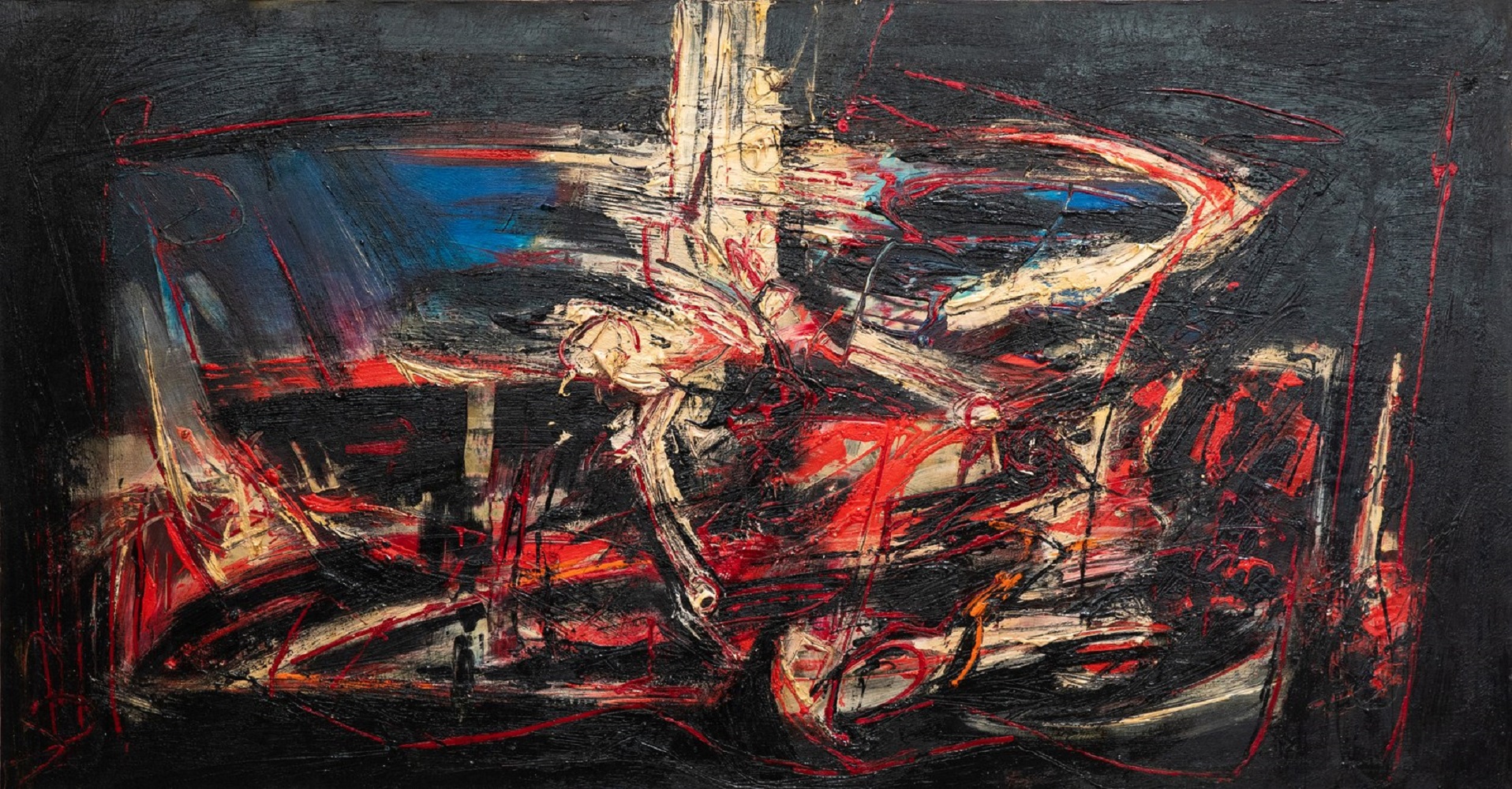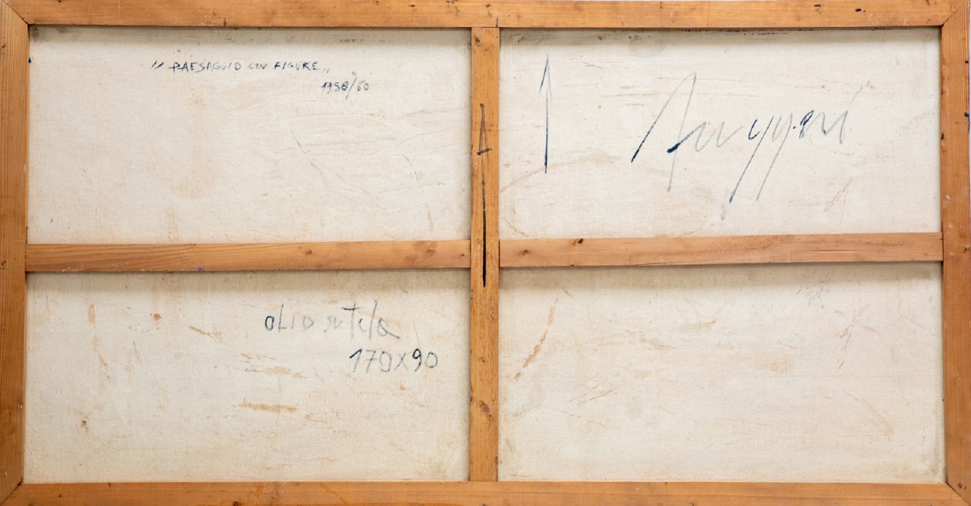 RUGGERI PIERO (1930 - 2009) Paesaggio con figure. Olio su tela . Cm 170,00 x 90,00. 1958-1960. Al retro titolo, firma e anno. Si ringrazia la Fondazione Piero Ruggeri, Torino, per aver confermato l'autenticità dell'opera. Lievi difetti. . Cornice presente