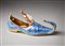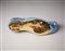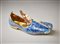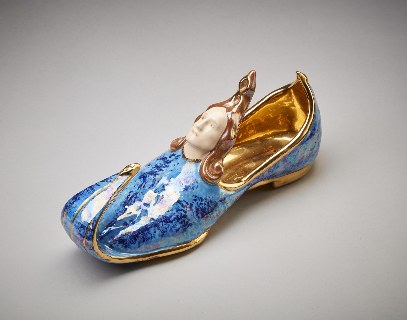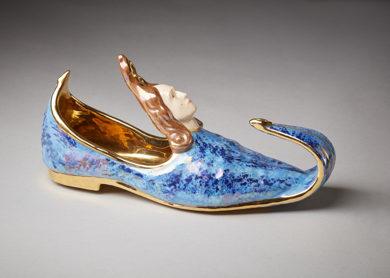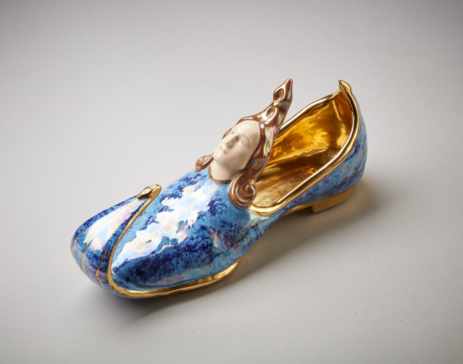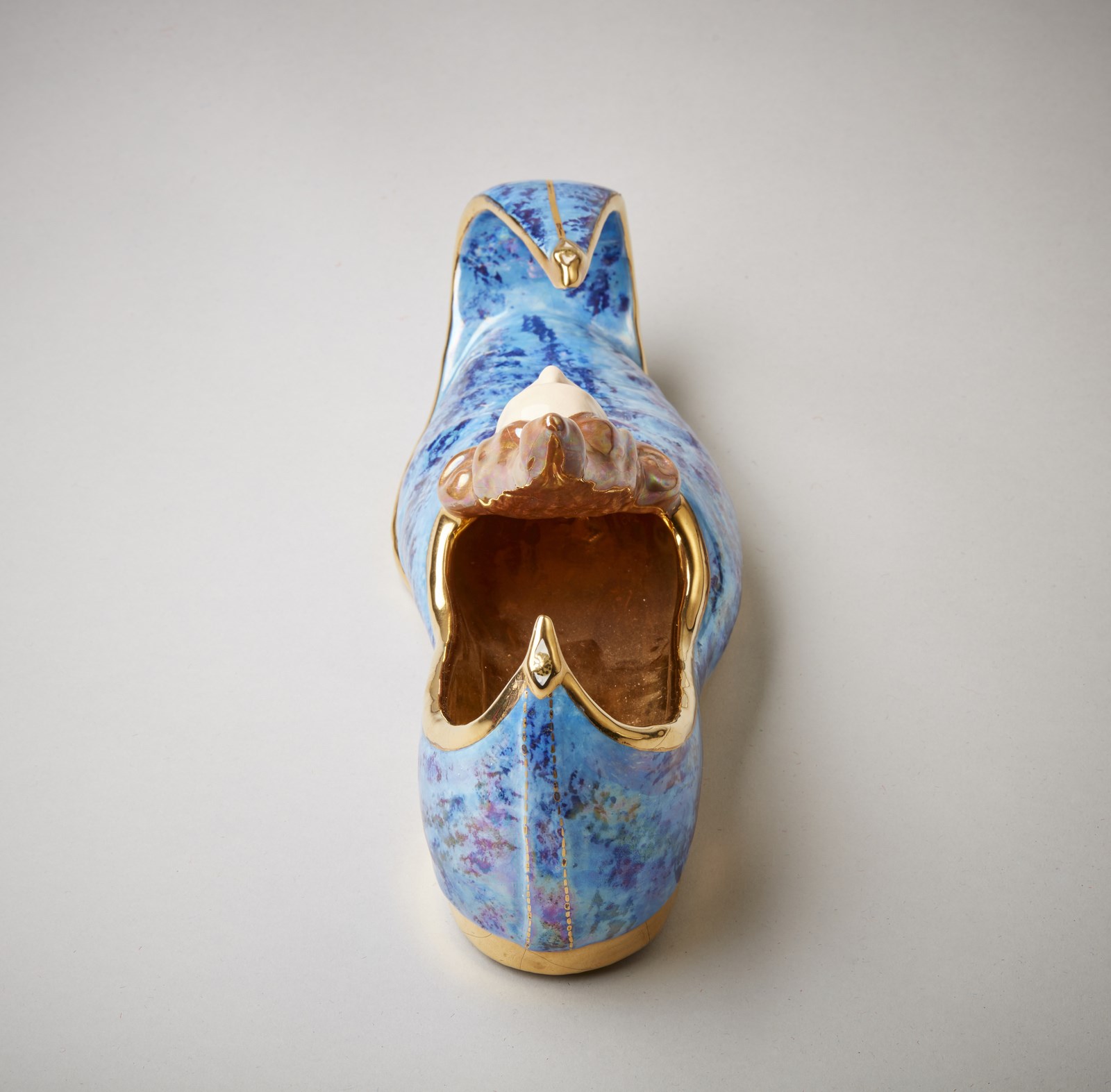 ONTANI LUIGI (n. 1943) Babbuccia orientale. 1995. Ceramica policroma. Cm 28,50 x 14,00 x 9,50. Scarpa in ceramica policroma su fondo azzurro. Firma sulla suola. Prodotto da Ceramiche Gatti Faenza (credito sotto la base). Autentica dell'artista su fotografia.