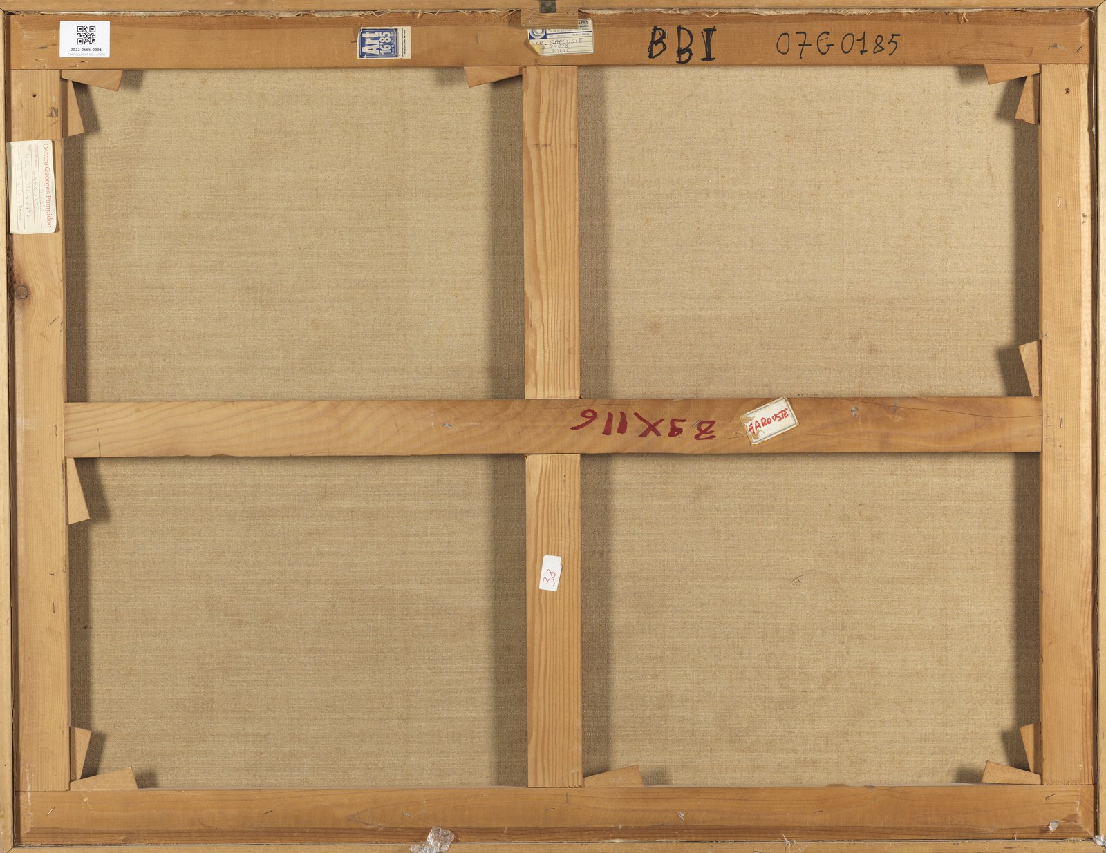 GAROUSTE GERARD (n. 1946) Senza titolo. . 1983. Olio su tela . Cm 115,00 x 90,00. Firma in basso a destra. Al retro cartiglio descrittivo Centre Georges Pompidou, Parigi. Provenienza: Galleria due Ci di Cleto Polcina, Roma; Collezione privata, Genova. Lievi difetti. . Cornice presente