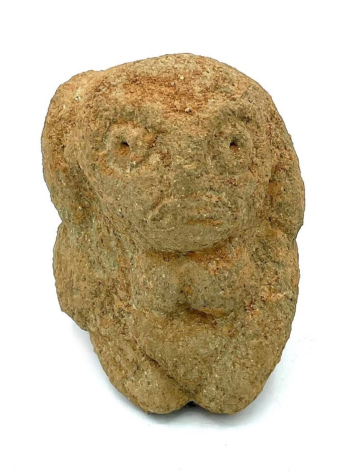 Figura femminile stilizzata in posizione seduta con le braccia portate dietro la nuca, la testa costituisce l'elemento principale ed e' dominata da grandi occhi circolari, naso appena prominente e bocca socchiusa; i seni, il ventre e gli arti inferiori sono appena accennati
