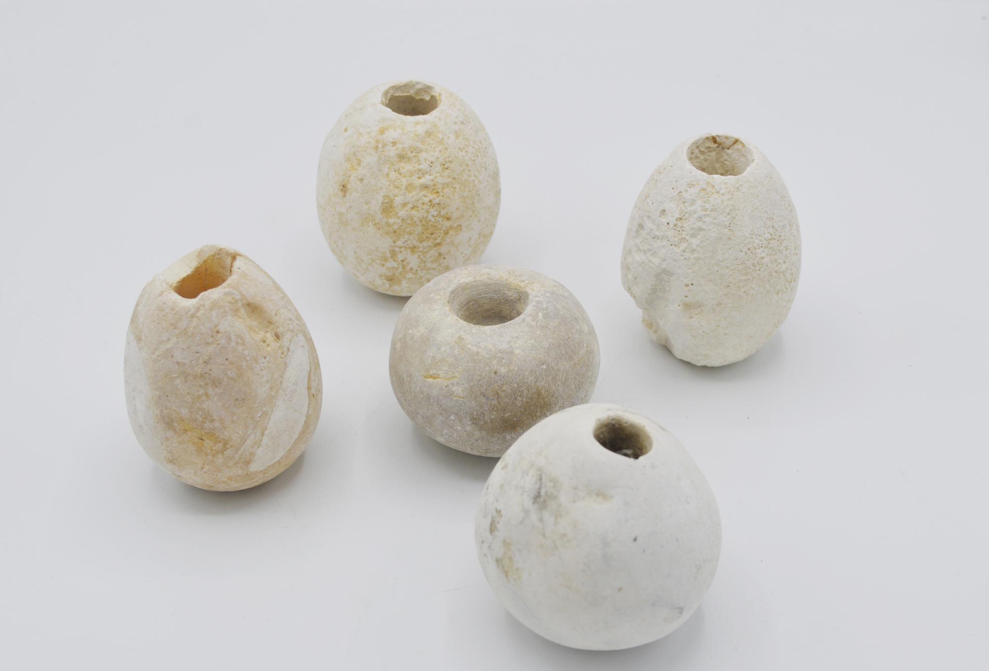 Cinque teste di mazza piriformi od ovoidi con foro al centro per l'inserimento dell'immanicatura. (5)
