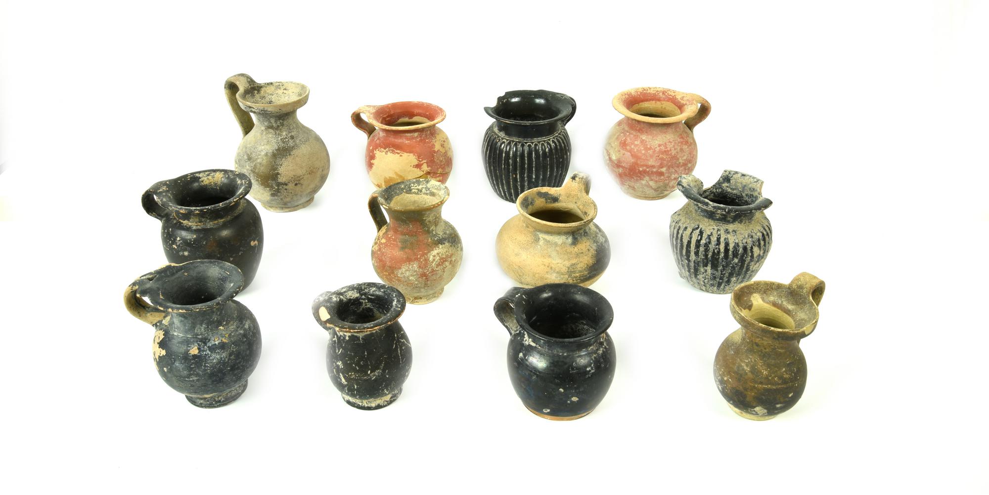 Dodici brocchette con labbro svasato, breve collo cilindrico a profilo concavo, corpo ovoide, fondo piatto o piede ad anello, ansa a nastro impostata verticalmente dal labbro alla spalla, due con ventre baccellato