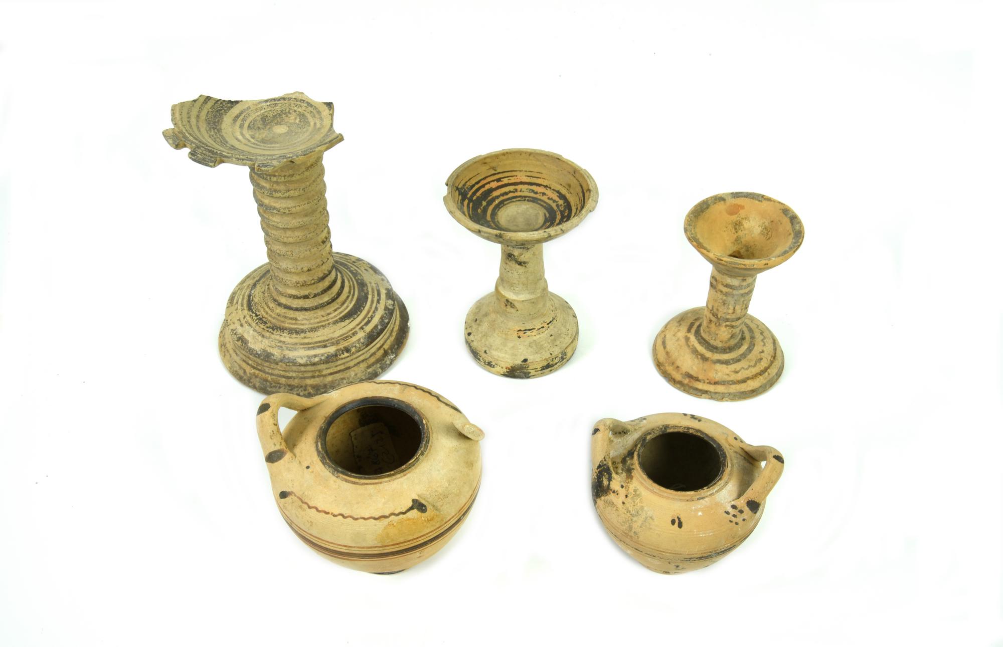 Due piccoli stamnoi con orlo rilevato e corpo ovoide, fondo piatto, anse a nastro impostate obliquamente sulla spalla, decorati a fasce, motivi a tremolo e rosette a puntini; tre thymiatheria con vasca superiore troncoconica, alto stelo cilindrico, piede campanulato, decorati a fasce