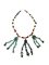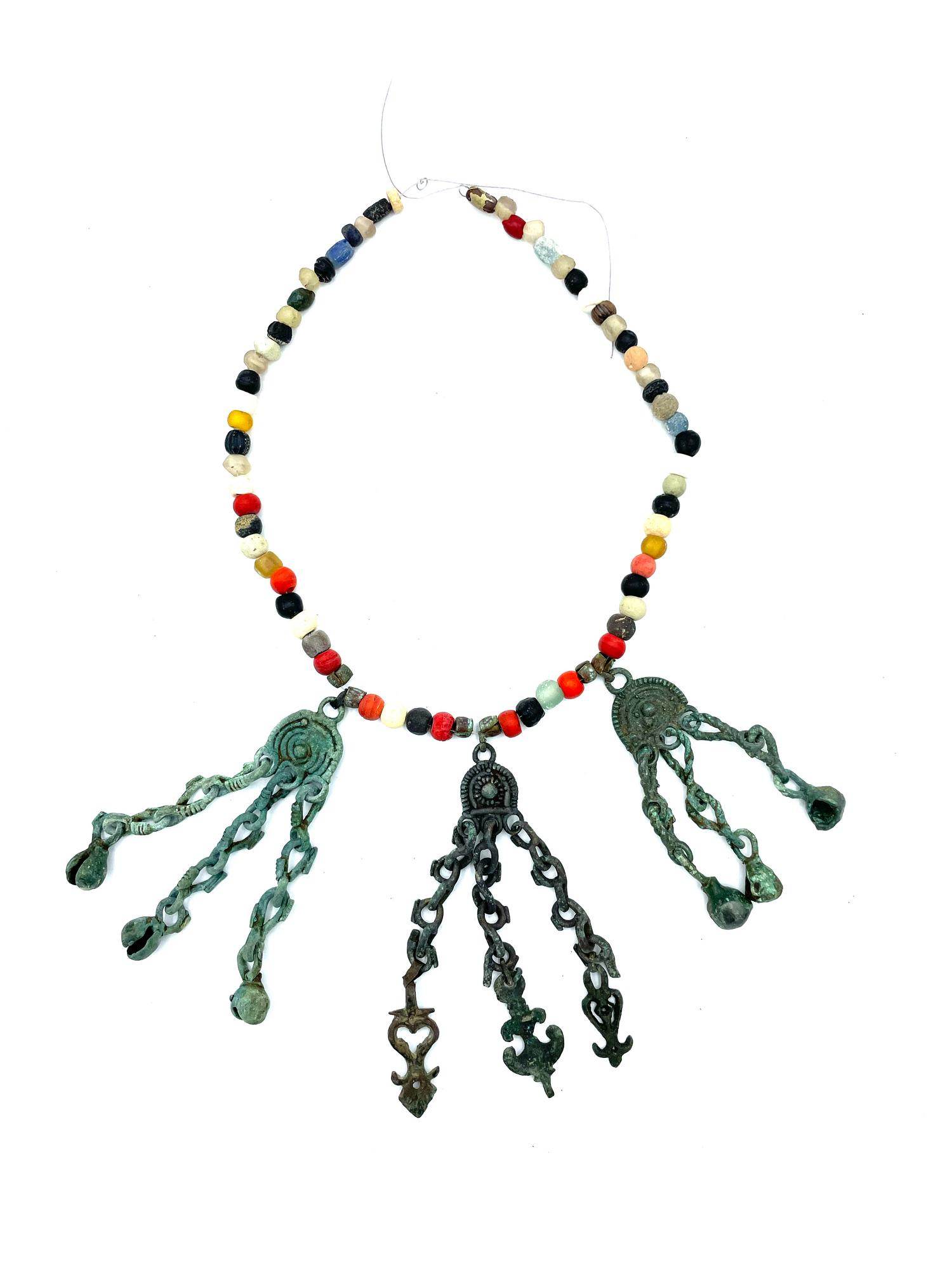 Collana ad un filo con vaghi in pasta vitrea colorata con tre grandi pendenti con catenelle desinenti in bubboli o elementi fitomorfi stilizzati, in bronzo fuso, cesellato e traforato