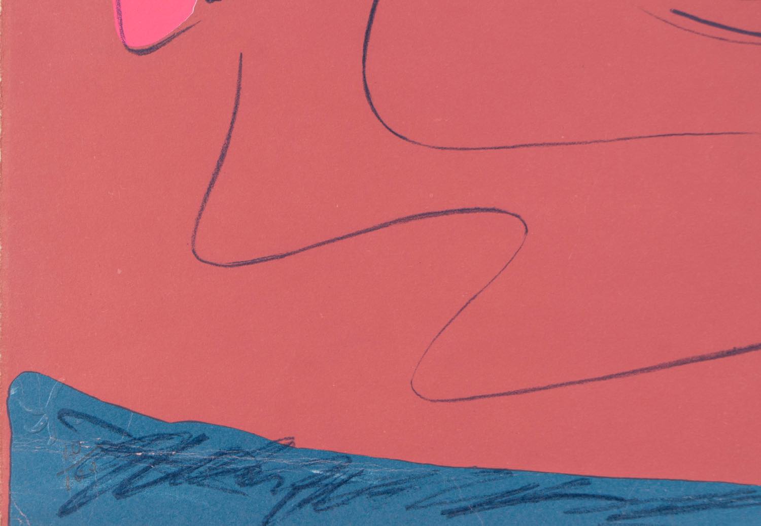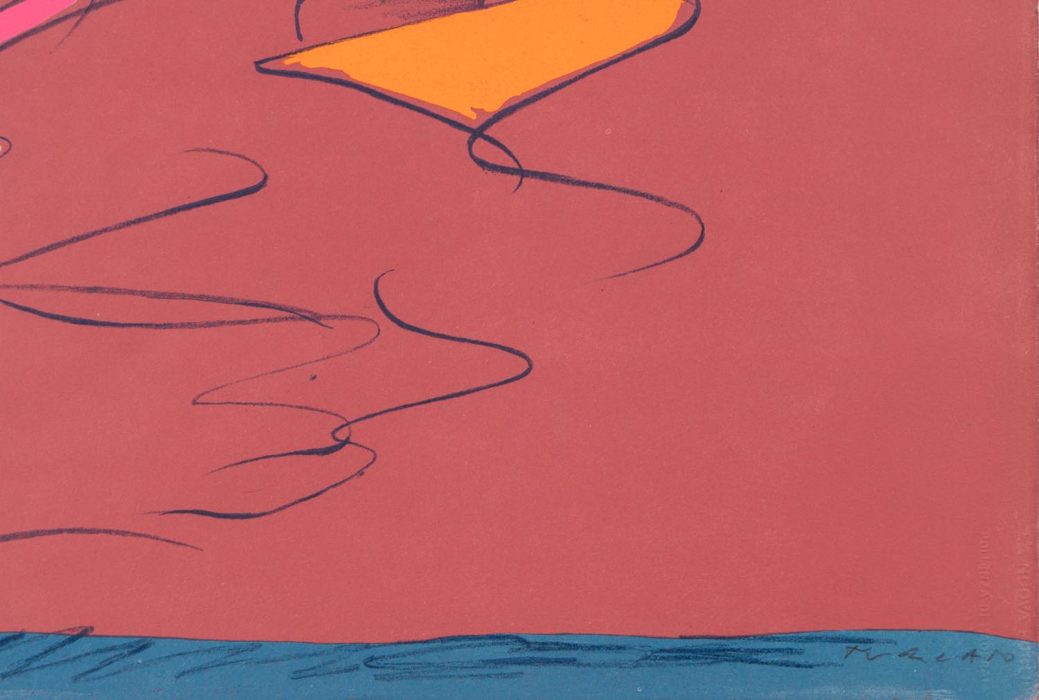 Litografia a colori su carta, firmata in basso a destra “Turcato”, numero di tiratura in basso a sinistra 60/100, reca timbri a secco dell’Archivio Giulio Turcato e “La nuova foglio Pollenza di Macerata”, H cm 50x70 (lievi difetti)