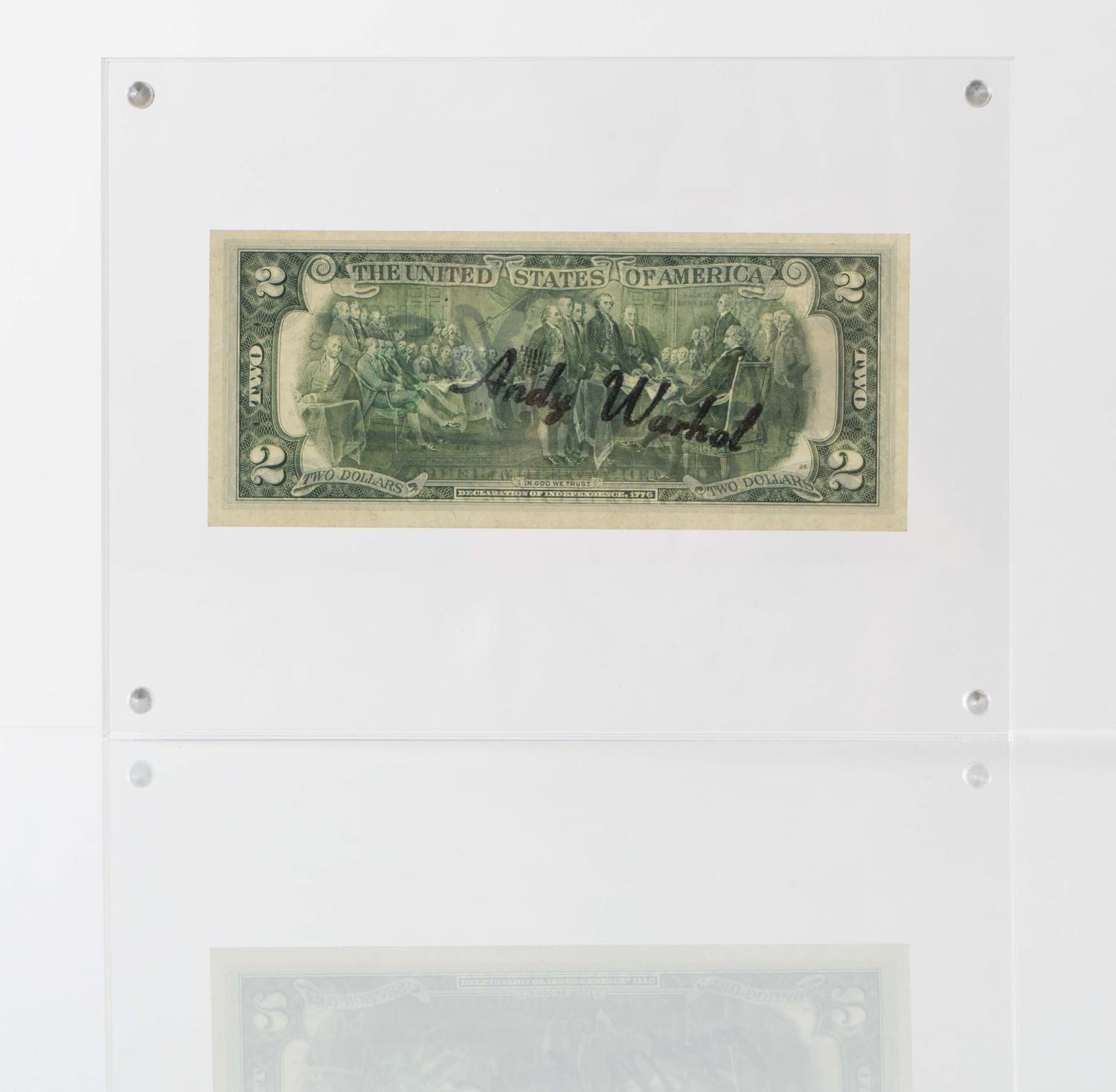 Pennarello su banconota, firmata sul fronte Andy Warhol, reca al retro timbro Andy Warhol, H cm 6.6x15.5 - entro plexiglas H cm 15x20.5 - Opera accompagnata da certificato di autenticità Galierie 32 - Nice con numero C11383632A, timbro e firma.