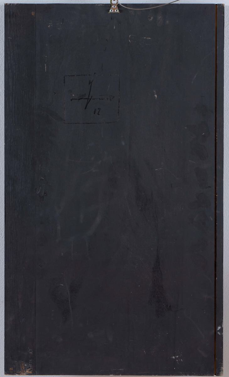 Affresco su tavola, firmato e datato al retro “Samorì/02”, H cm 85x50 - Opera accompagnata da fotografia dell’artista con il dipinto con al retro iscrizione per autentica “Opera mia autentica Nicola Samorì”.