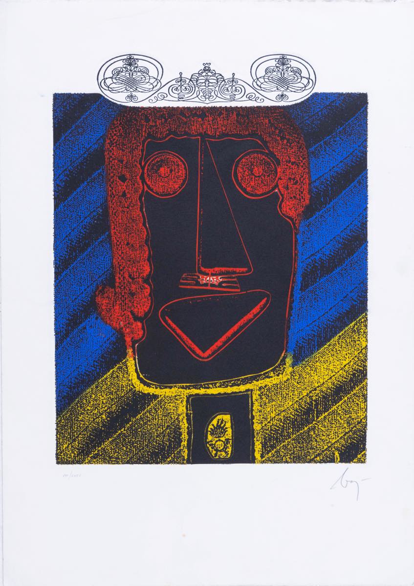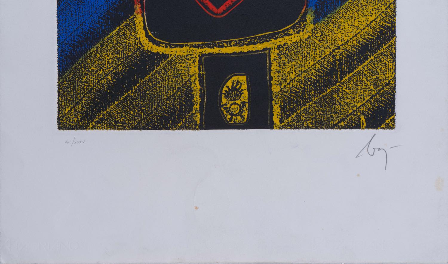 Calcografia plastificata e rifilata a colori su carta, firmata in basso a destra “Baj”, numero di tiratura in basso a sinistra VIII/XXV, Foglio H cm 70x50 (lievi usure)