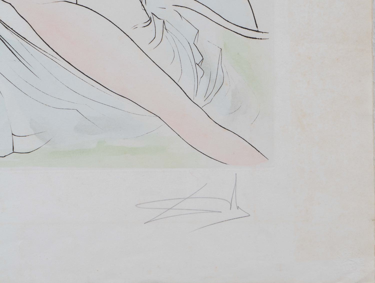 Acquaforte acquatinta a colori su carta, firmata in basso a destra Dalì, numero di tiratura in basso a sinistra 66/150, reca timbro a secco Il Tempio dell'Arte – Roma, reca al retro etichetta e timbri per certificato di autenticità e provenienza Collezione Il Tempio dell'Arte – Roma, Lastra H cm 38x57.5 – Foglio H cm 54.5x75 (usure)