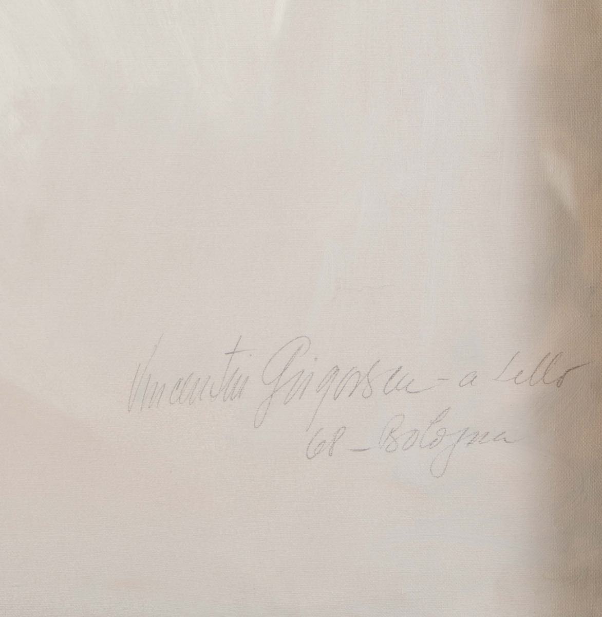Olio su tela, reca in basso a destra iscrizione con firma dell’artista, dedica, data e luogo “Vincentiu Grigorescu – a Lello/68 – Bologna”, H cm 94x84 – con cornice H cm 98x88
