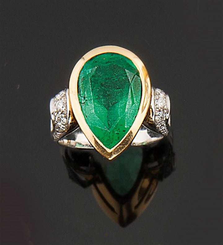 Anello in oro bianco, sommità in oro giallo, recante grande smeraldo taglio a goccia di ct 8,84