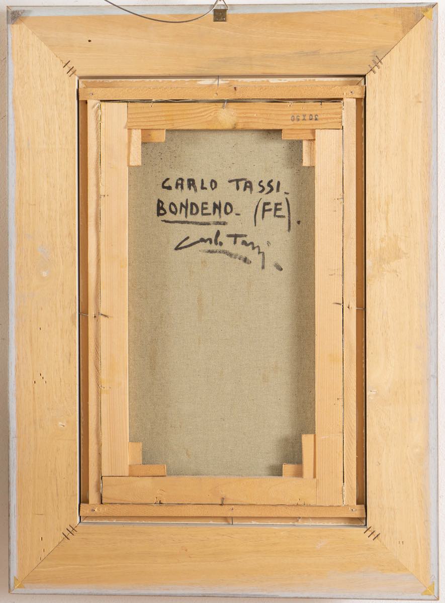 Olio su tela, firmato in basso a sinistra “Carlo Tassi”, al retro reca iscrizione “Carlo Tassi/Bondeno (FE)” e firma dell’artista, H cm 50x30 – con cornice H cm 74x54