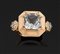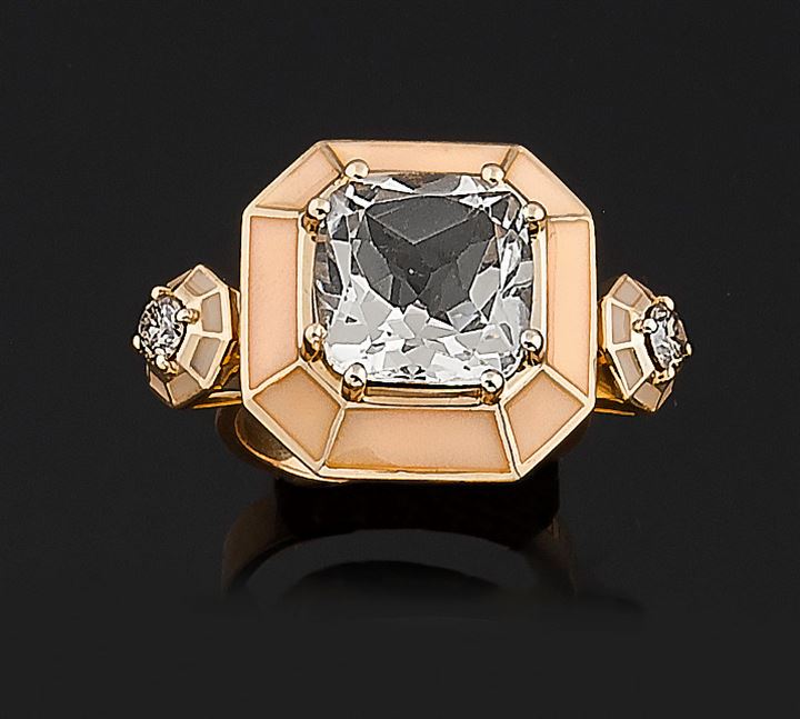 Anello in oro giallo, firmato "Fragile", recante al centro quarzo taglio a cuscino, montato entro ottagono in smalto beige, ai lati due diamanti taglio brillante color cognac montati entro castoni tondi in smalto beige