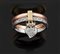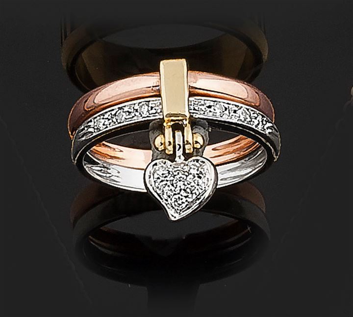 Anello composto da due fasce in oro rosa e bianco raccordate da segmento geometrico in oro giallo con piccolo cuore pendente in diamanti taglio brillante per complessivi ct 0,13 ca