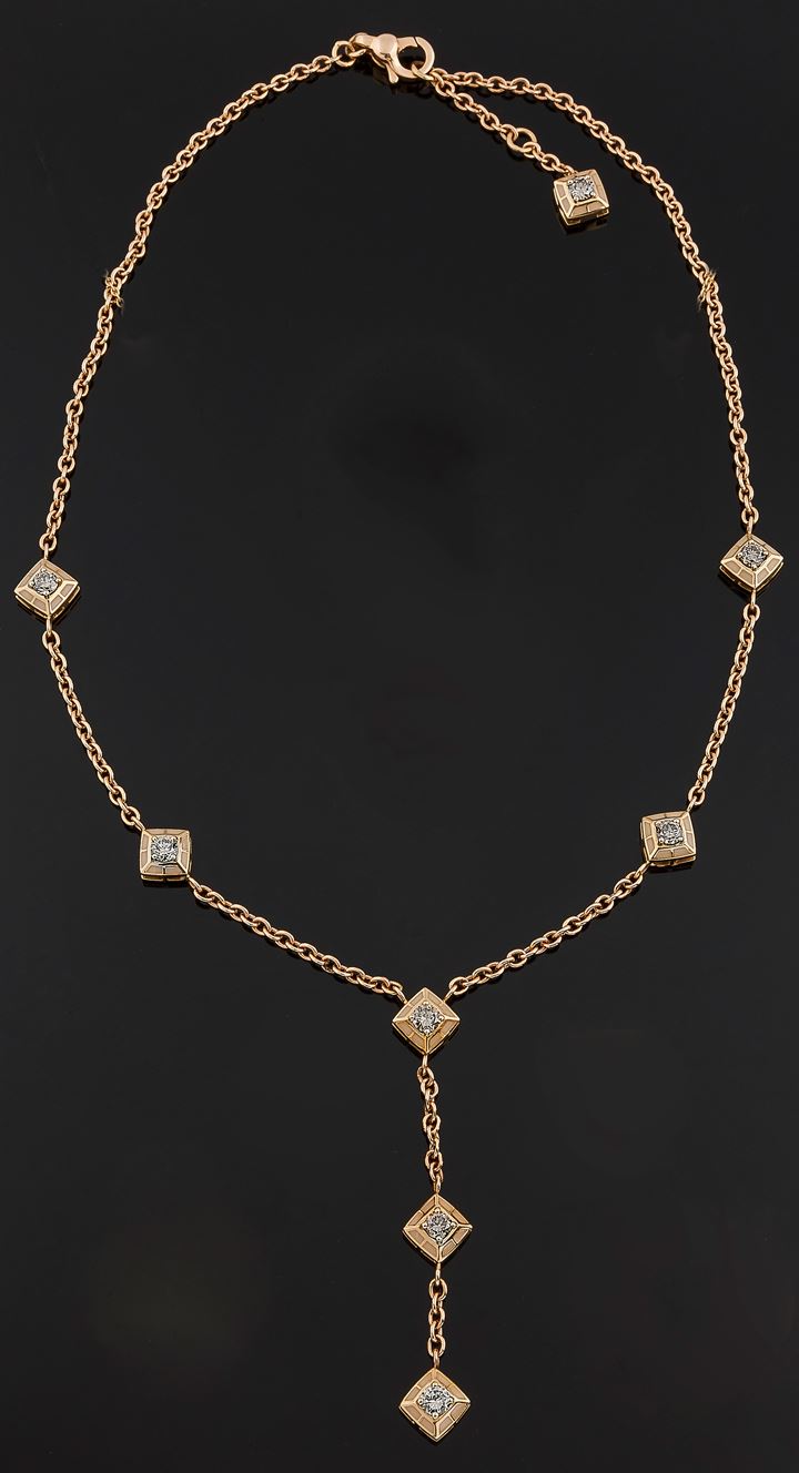 Collana in oro rosa lavorata a maglie semplici con otto rombi in smalto beige con diamanti color cognac taglio brillante per complessivi ct 1,65 ca