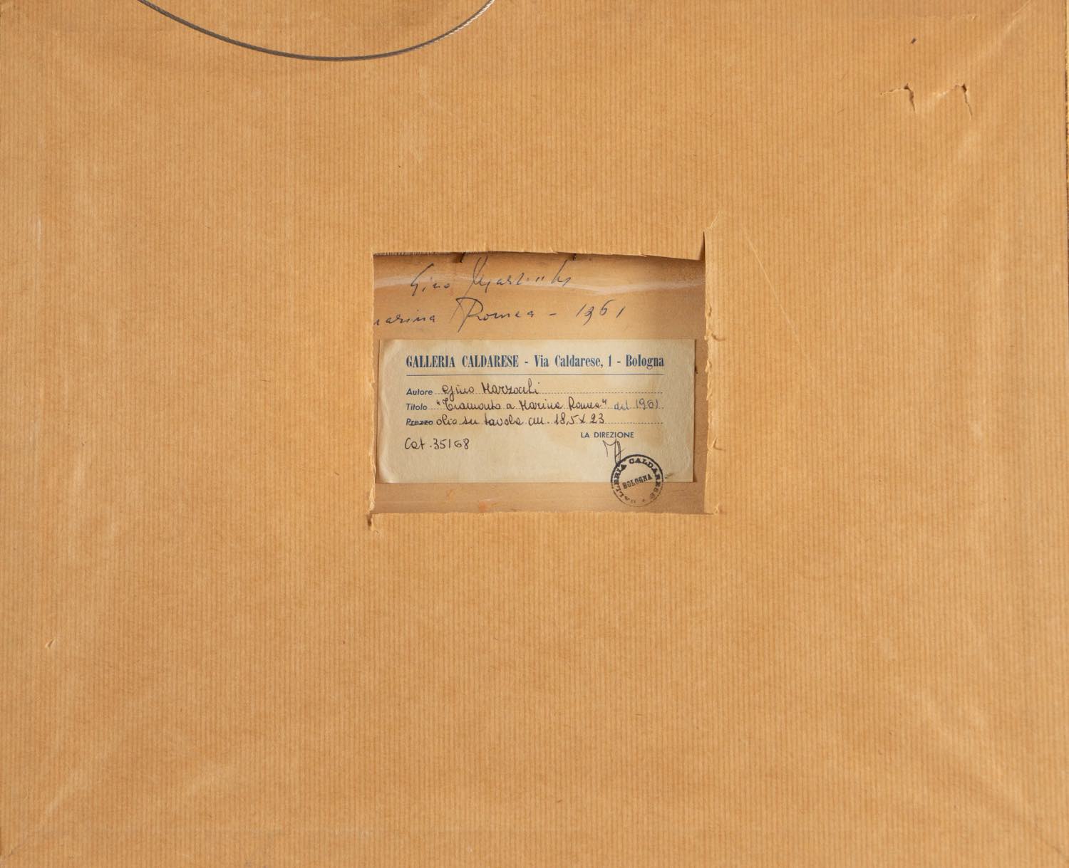 Olio su tavoletta, reca al retro firma, titolo, data e etichetta e timbro della Galleria Caldarese – Bologna, H cm 16x23 – con cornice H cm 36x42