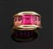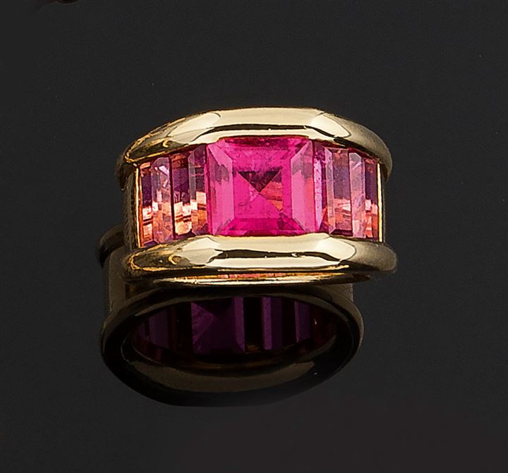 Anello in oro giallo, a fascia, firmato "Fasano", sommità recante cinque rubelliti taglio carrè e baguette