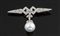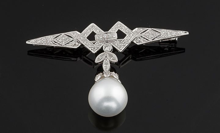 Spilla in oro bianco, a barretta, interamente in diamanti taglio brillante e navette per complessivi ct 0,55 ca con perla australiana pendente del diam di mm 13