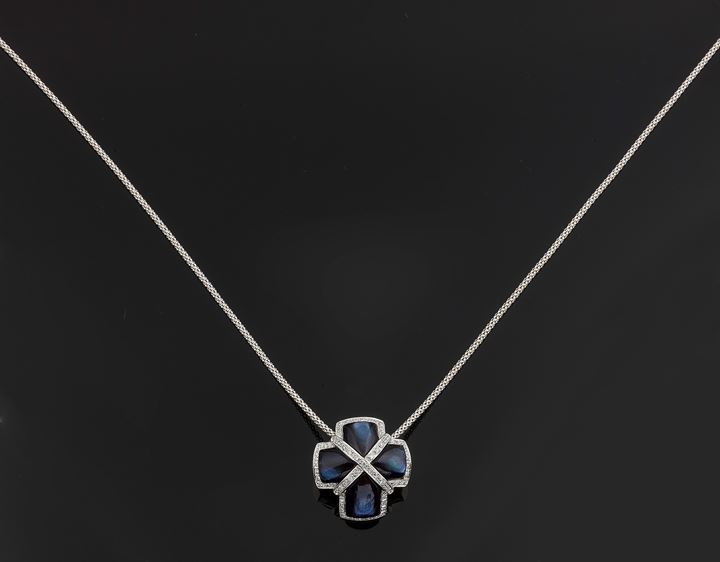 Catena con ciondolo in oro bianco a forma di croce con placche in madreperla e diamanti per