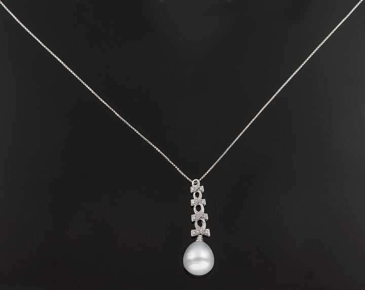 Girocollo in oro bianco con una perla South Sea a forma di goccia del diam di mm.14 sormontata da diamanti taglio brillante per complessivi ct 0,20