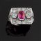 Anello in oro bianco, sommità piatta, epoca primi anni '900, con al centro rubino taglio ovale ed ai lati due diamanti taglio brillante di vecchio taglio per complessivi ct 1,0 ca