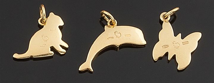 Lotto composto da tre ciondoli in oro giallo, firmato "Pomellato", modello "Dodo" raffiguranti una farfalla, un delfino e un gatto