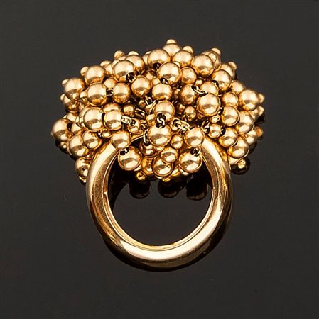 Anello in oro giallo con sommità composta da piccole sfere disposte a formare un cespuglio con elementi mobili