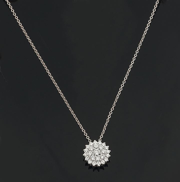 Catena con ciondolo in oro bianco di forma rotonda con diamanti taglio brillante per complessivi ct 0,75 ca