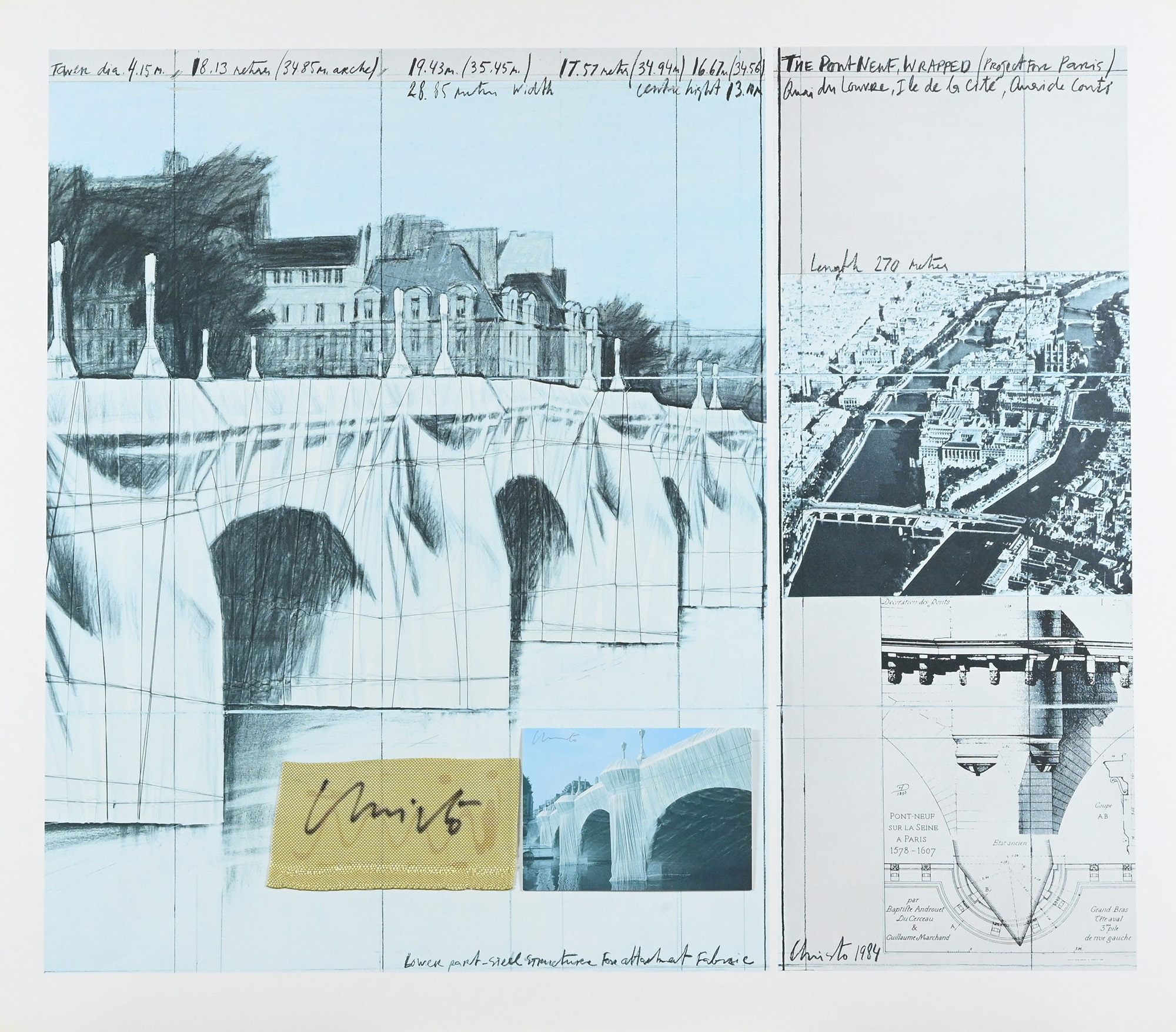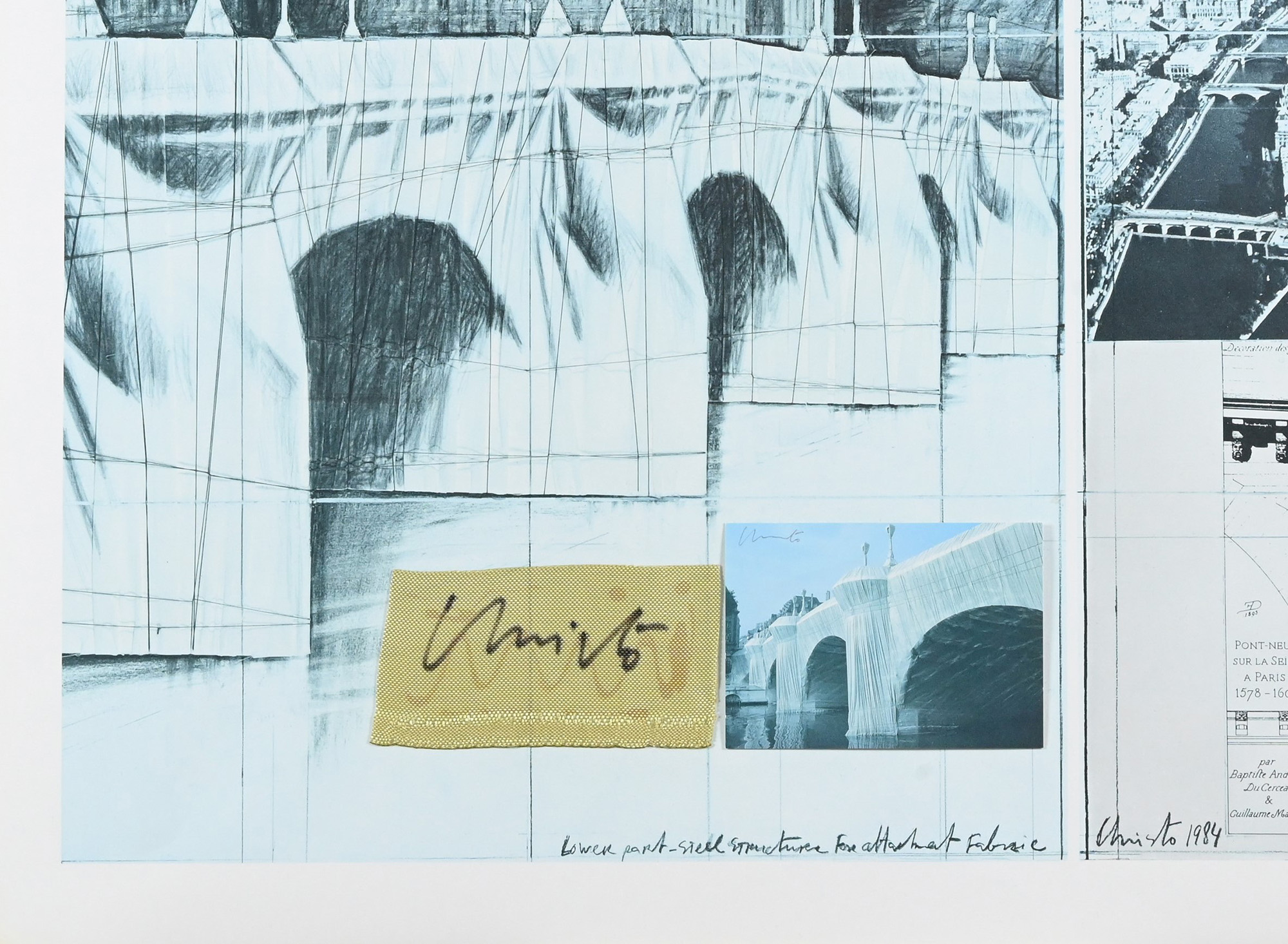 "The Pont Neuf, wrapped project for Paris". Year 1985. Offset lithograph with photo collage and fabric collage. Size 68x78cm. Hand signed both on photo collage and fabric collage. Published by Nouvelles Images Editeurs 1985/45700 Lombreuil, France. Framed with plexiglass. Provenance: Private Collection, Italy