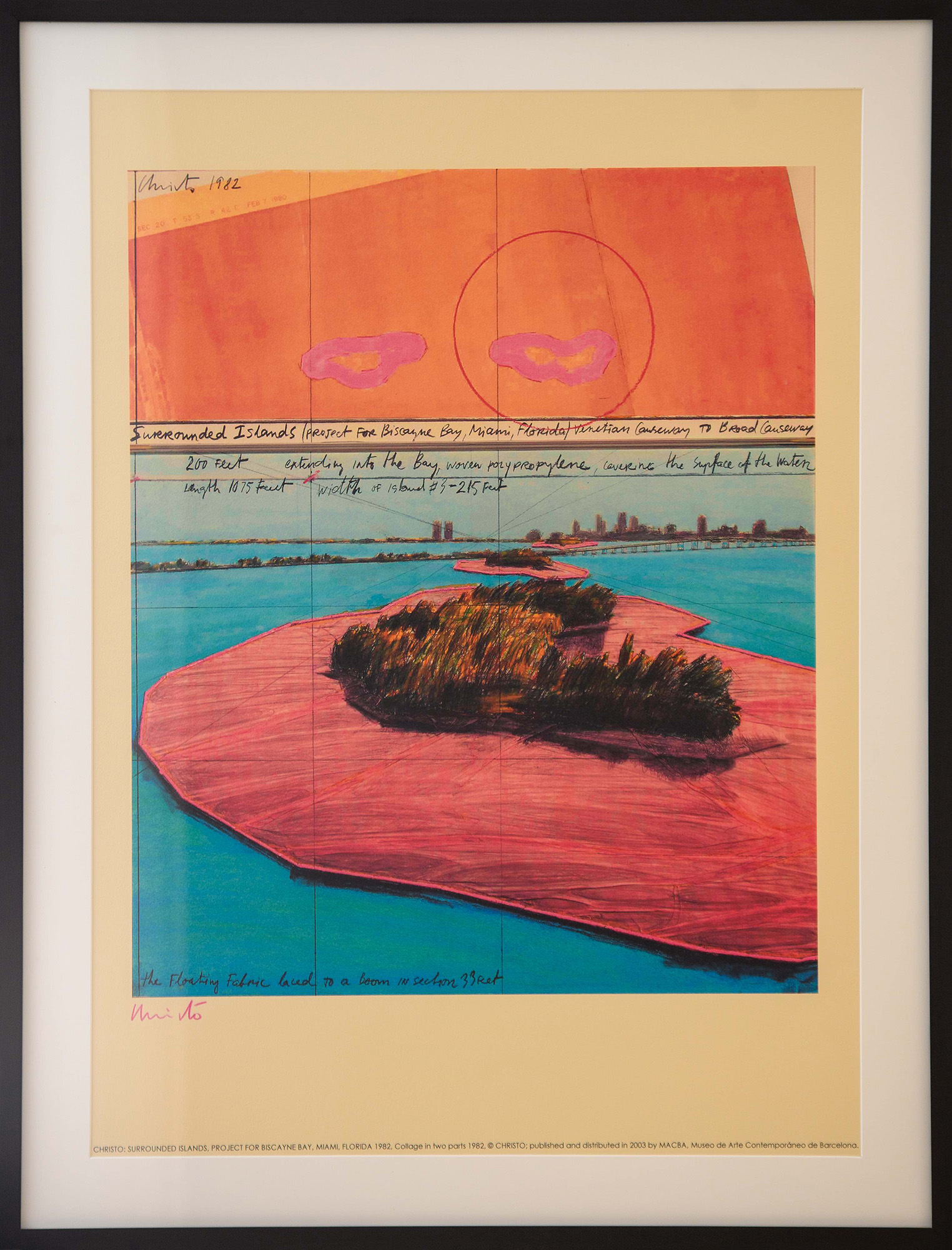 "Surrounded Islands, Project for Biscayne Bay, Miami - Florida 1982". Size: cm 56,5 x 76,5 - in 22,3 x 30,1. Year 2003. Chromolithograph on museum cardboard. Edition of 350. Hand signed by Christo lower left, not numbered. Published and distribuited in 2003 by MACBA, Museo de Arte Contemporaneo de Barcellona. On the back COA with stamp, title and signature of Grafiche d'Arte Lombardi. Framed with black frame and protective glass. Provenance: Private Collection Italy